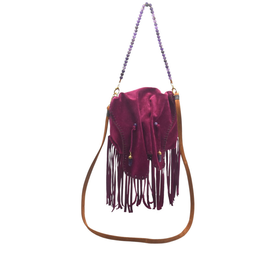This is the Fringed Butterfly Bag with Amethyst Beads in the deepest, most luscious wine-colored suede, with beaded accents that invite touch and spark inspiration. The bag has a Amethyst Beaded handle or you can switch to a detachable shoulder strap.