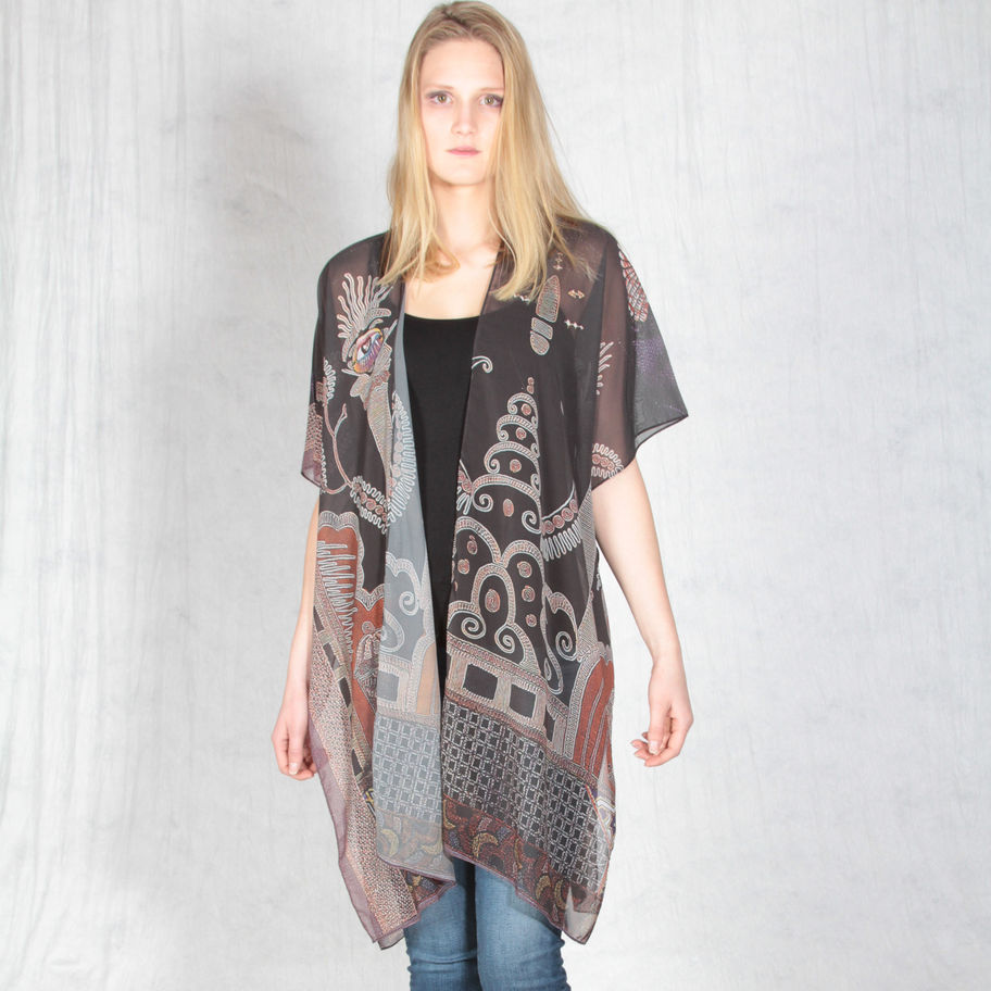 This boho wrap is made from 100% polyester chiffon. It is a flowy, super-soft, semi-sheer, open-front kimono with a relaxed fit. Perfect for travel. Feel comfortable, elegant and fashionable the whole day. The original Amy Zerner tapestry art design covers the entire garment. The backside mirrors the front. Whether out on the town or at the beach, this light and airy piece makes the perfect go-to accessory to style any outfit. Wear it with your favorite pair of jeans or leggings or slip on over a swimsuit for a chic, standout look. Fits most sizes.